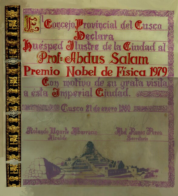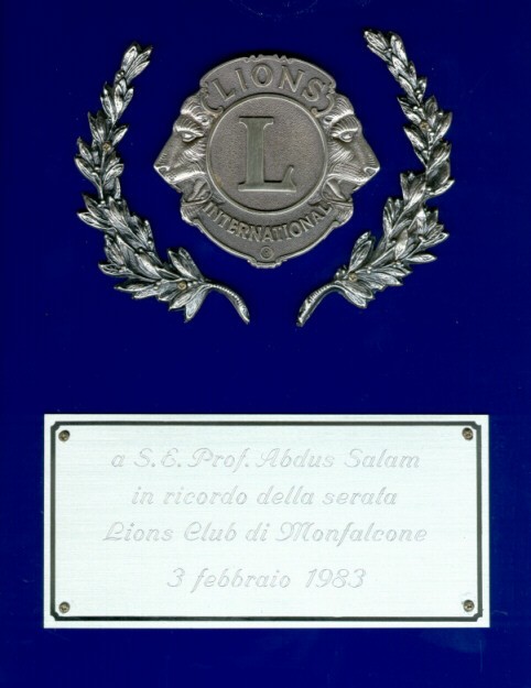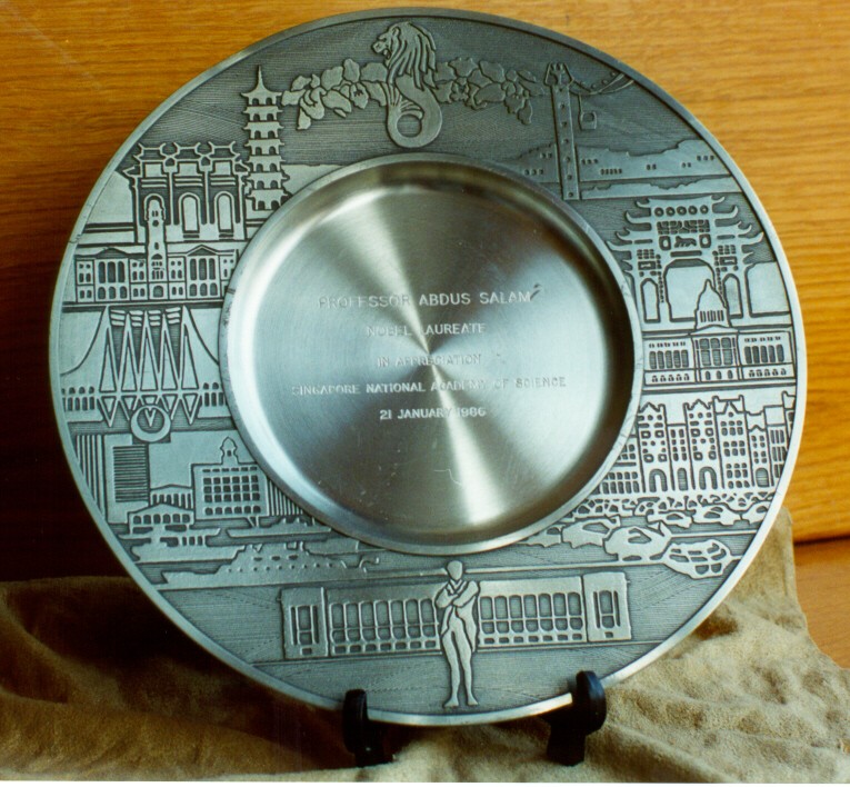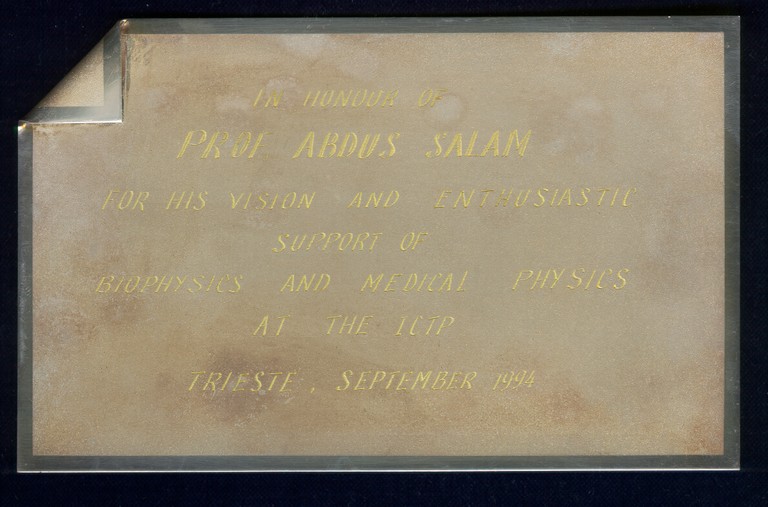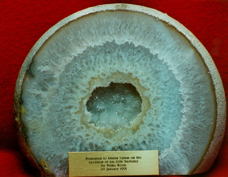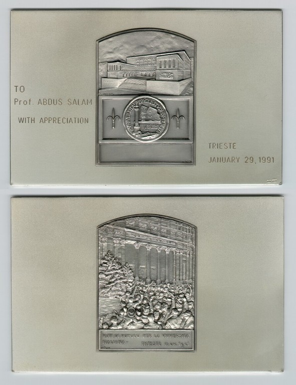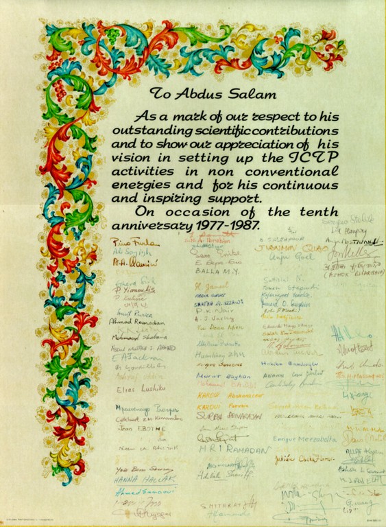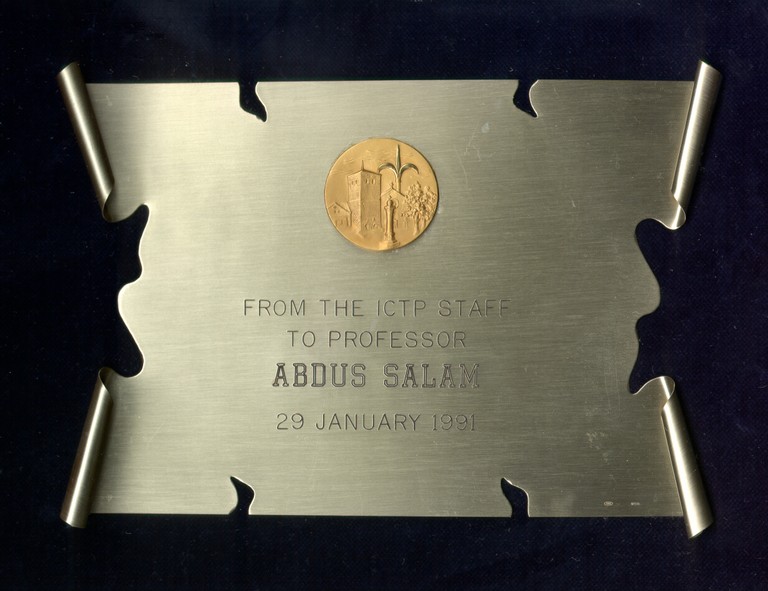 Presented to Professor Abdus Salam. On exhibition in the Marie Curie Library.